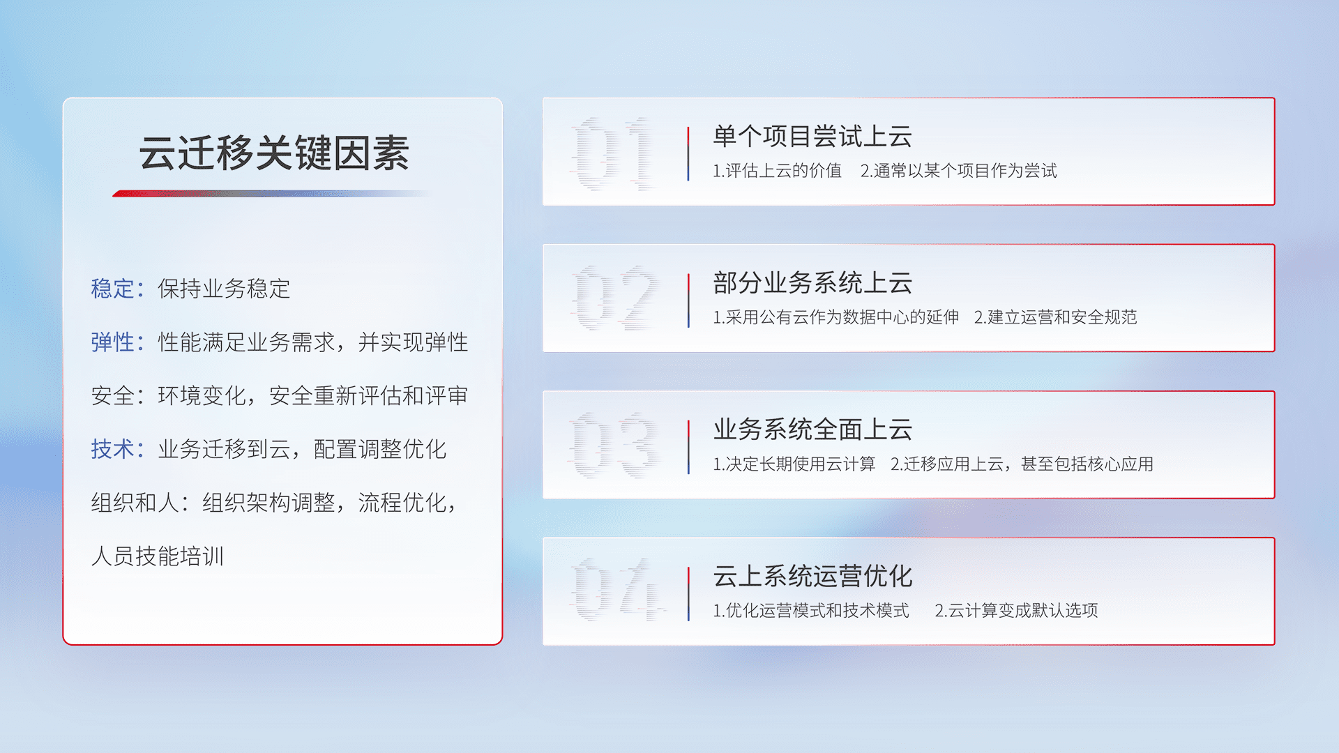 结合实际业务,,,从规划设计、、、云平台选型、、、云原生改造、、数据迁移、、、集成交付,,,,迁移全过程为客户识别最佳上云路径,,做好风险识别管理,,,,设计网络架构、、身份权限、、安全审计合规、、、、操作审计、、、、日志审计、、、监控告警策略、、多站点容灾设计等,,对云上基础设施进行整体规划,,提升IT治理水平,,以满足弹性、、高可用、、高性能的需求。。。