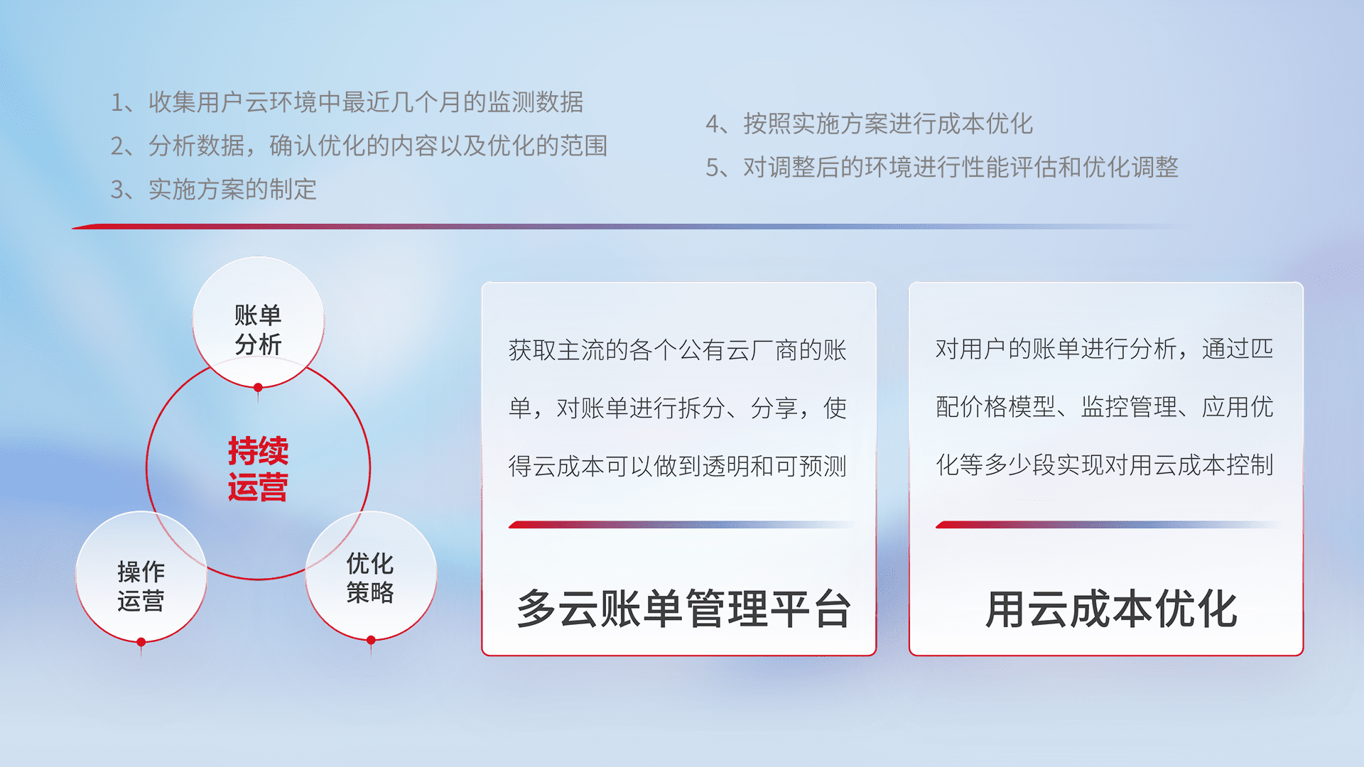 通过多云纳管,,,,以统一的资源数据模型把客户的云资源进行抽象和封装,,,进而实现对多云资源的统一操作,,,,保障云资源管理的可靠性、、、、稳定性与可用性。。。。量身定制化运维内容,,,配置、、、、开发运维、、、、补丁管理、、、备份、、、监控、、、认证和访问管理、、、、审计和日常巡检等,,,,保障在用云过程中的可靠度,,,,稳定度以及高可用率。。